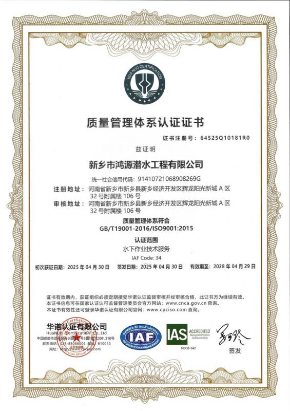 新鄉市鴻源潛水工程有限公司,有從事潛水行業二十多年的潛水團隊。公司具有獨立法人資格,注冊資金600萬元。   公司的潛水人員、潛水檢測人員、潛水焊接人員均經過正規培訓,全部持有國內權威機構頒發的資質證書。我公司水下焊接可靠,質量優良,技術過硬,可水下焊接鋼管樁,水下焊接犧牲陽極鋅塊,水下焊接連接梁,水下封堵焊接等等施工,報價合理,拒絕暴利,竭誠為您服務!水下電焊工程,水下電焊報價合理水廠電廠的水池、水道清淤、泵房清理、管道鋪放、攔污柵清污、更換閘門起落、導流洞、水庫壩體等維修施工水下補強加固:對水利電力系統水庫、大壩及沿海內河港口、碼頭等水工建筑物水下鋼結構或混凝土結構缺陷進行。無論是對現在或將來,都將是一項非常有意義的工作。水下焊接將成為水下作業,水下安裝,水下維修等水下作業工程中不可或缺的重要工藝手段.公司堅持“先進的技術設備.優質的服務質量.服務效率.熱情的服務態度,為生產經營理念,以拒絕暴利合理收費為原則立足全國市場。我們將以優質的產品與售后服務來打造用戶良好體驗。愿同新老客戶竭誠合作、互惠互利、共創輝煌!水下電焊工程,水下電焊報價合理,鋼圍堰清淤公司鴻源-水下電焊工程,水下電焊報價合理,鋼圍堰清淤公司,水下電焊工程。      新鄉市鴻源潛水工程有限公司我公司成功打造鴻源優質服務。公司的潛水人員、潛水檢測人員、潛水焊接人員均經過正規培訓,全部持有國內權威機構頒發的資質證書。經過多年經營,公司具備公司具有獨立法人資格。